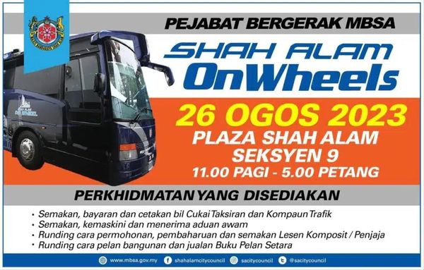 ஷா ஆலம், ஆகஸ்ட் 24: ஷா ஆலம் மாநகராட்சி (எம்பிஎஸ்ஏ) ஆகஸ்ட் 26 அன்று, பிளாசா ஷா ஆலம், பிரிவு 9 இன் வாகன நிறுத்துமிடத்தில் நடமாடும் அலுவலகச் சேவைகளை வழங்குகிறது.
