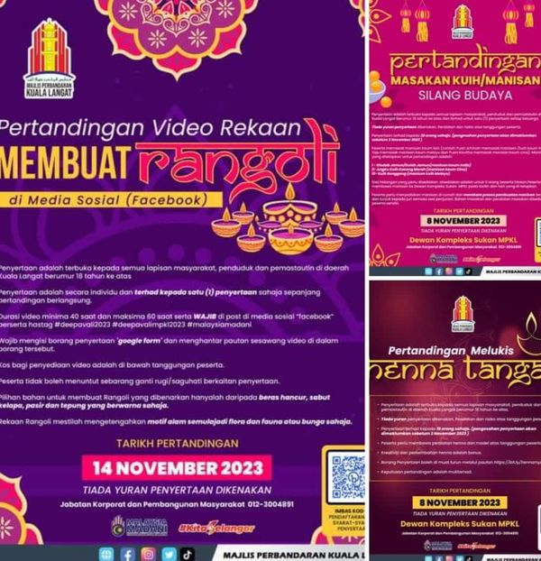 ஷா ஆலம், அக் 22- அடுத்த மாதம் 12ஆம் தேதி கொண்டாடப்படவிருக்கும் தீபாவளிப் பண்டிகையைக் குதூகலமாக்க கோல லங்காட் நகராண்மைக் கழகம் மூன்று போட்டிகளுக்கு ஏற்பாடு செய்துள்ளது.