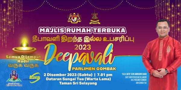 ஷா ஆலம், நவ 30 - கோம்பாக் நாடாளுமன்ற மற்றும் சுங்கை துவா சட்டமன்றத் தொகுதி நிலையிலான தீபாவளி திறந்த இல்ல உபசரிப்பு எதிர்வரும் டிசம்பர் 2ஆம் தேதி சனிக்கிழமை நடைபெறவுள்ளது.தாமான் ஸ்ரீ செலாயாங் டத்தாரான் சுங்கை துவாவில் (பழைய வார்த்தா) இரவு மணி 7.01 தொடங்கி இந்த பொது உபசரிப்பு சிறப்பான முறையில் நடைபெறும் என்று கோம்பாக் நாடாளுமன்ற உறுப்பினரும் சுங்கை துவா சட்டமன்ற உறுப்பினருமான