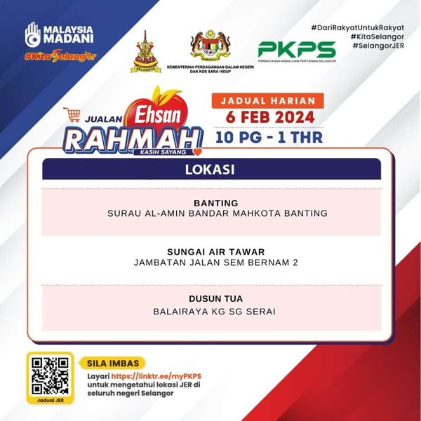 இன்று சுராவ் அல் - அமின் பண்டார் மக்கோத்தா (பந்திங்), ஜாலான் செம் பெர்ணம் 2 பாலம் (சுங்கை ஆயர் தாவார்) மற்றும் பாலாய் ராயா கம்போங் சுங்கை செராய் (டுசுன் துவா) ஆகிய இடங்களில் மலிவு விற்பனை நடைபெறும்.