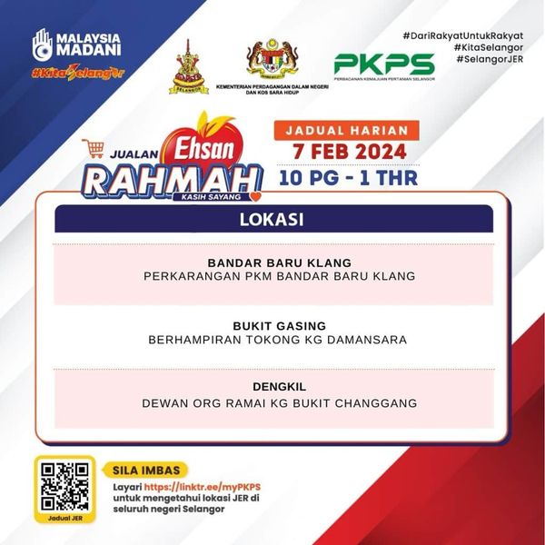 இன்று பிகேஎம் பண்டார் பாரு கிள்ளான் வளாகம் (பண்டார் பாரு கிள்ளான்), தோகோங் கம்போங் டாமன்சாரா அருகில் (புக்கிட் காசிங்) மற்றும் கம்போங் புக்கிட் சங்காங் பொது மண்டபம் (டெங்கில்) ஆகிய இடங்களில் மலிவு விற்பனை நடைபெறும்.