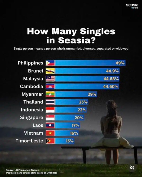 ஷா ஆலம், பிப் 16: சீ ஏசியா புள்ளிவிவரக் கணக்கெடுப்பின்படி, தென்கிழக்கு ஆசியாவில் திருமணம் ஆகாமல் இருப்பவர்களைக் கொண்டிருப்பதில் மலேசியா மூன்றாவது இடத்தில் உள்ளது (44.68 சதவீதம்).
