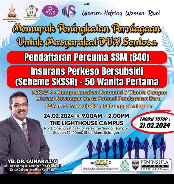 ஷா ஆலம், பிப் 20: எதிர்வரும் சனிக்கிழமை செந்தோசா தொகுதியில் உள்ள மகளிரின் வணிக வளர்ச்சி மற்றும் மேம்பாட்டுக்கு உதவும் சிறப்பு பயிற்சி திட்டத்தை செந்தோசா சட்டமன்ற உறுப்பினர் டாக்டர் குணராஜ் ` ஷா ஆலமிலுள்ள ``The Lighthouse Campus சில் காலை 9 மணி முதல் பிற்பகல் 2 மணி வரை ஏற்பாடு செய்துள்ளார்.