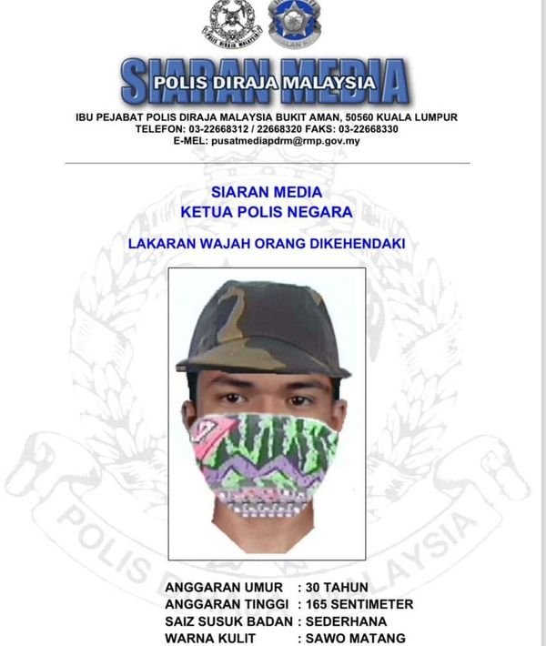 மே 5 ஆம் தேதி பெட்டாலிங் ஜெயாவில் உள்ள ஒரு ஷாப்பிங் சென்டரில் நடந்த இச்சம்பவத்தில் தொடர்புடைய சந்தேக நபர் 165 சென்டிமீட்டர் உயரம், சுமார் 30 வயது, மற்றும் நடுத்தர உடல் உடையவர் என்று காவல்துறை அதிகாரி ஜெனரல் டான்ஸ்ரீ ரஸாருடின் ஹுசைன் கூறினார்.