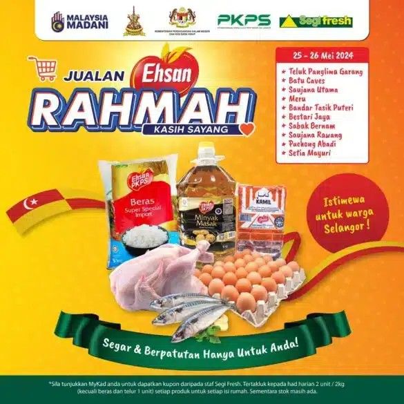 சிலாங்கூர் விவசாய மேம்பாட்டுக் கழகத்துடன் (PKPS) இணைந்து தெலுக் பங்லிமா கராங், பத்து கேவ்ஸ், சௌஜானா உத்தாமா, மேரு மற்றும் தாசிக் புத்தேரி கிளைகளில் மலிவு விற்பனை நடைபெறவுள்ளதாக ஃபேஸ்புக் மூலம் Segi Fresh தெரிவித்துள்ளது.