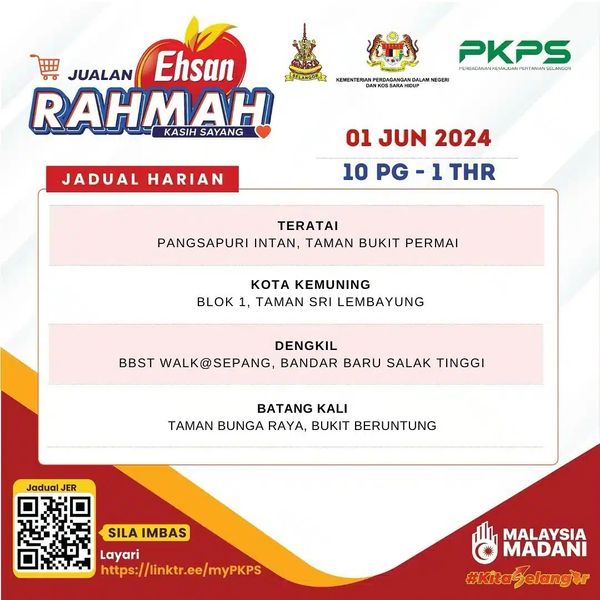 மலிவான விற்பனையின் சமீபத்திய இருப்பிடத்தைச் PKPS Facebook இல் அல்லது விற்பனைச் சுவரொட்டியில் உள்ள QR குறியீட்டை ஸ்கேன் செய்வதன் மூலம் அல்லது http://linktr.ee/myPKPS இணைப்பைச் சரிபார்க்கலாம்.