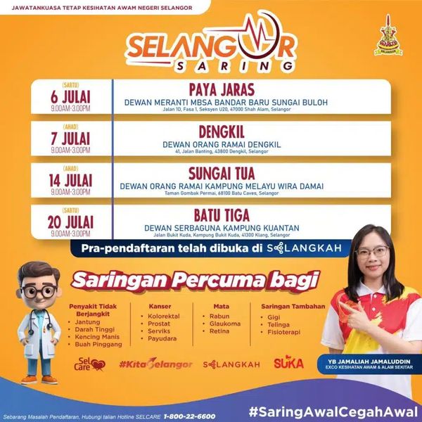 ஷா ஆலம், ஜூலை 5: இந்த மாதத்தில் பாயா ஜாராஸ், டெங்கில், சுங்கை துவா மற்றும் பத்து தீகா ஆகிய தொகுதிகளில் மாநில அரசால் ஏற்பாடு செய்யப்பட்ட இலவசச் சுகாதார பரிசோதனைத் திட்டம் காலை 9 மணி முதல் மாலை 3 மணி வரை நடைபெறும்.