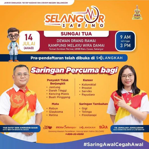 ஷா ஆலம், ஜூலை 13: நாளை சுங்கை துவா தொகுதியில் மாநில அரசால் ஏற்பாடு செய்யப்பட்ட இலவசச் சுகாதார பரிசோதனைத் திட்டம் காலை 9 மணி முதல் மாலை 3 மணி வரை நடைபெறும்.