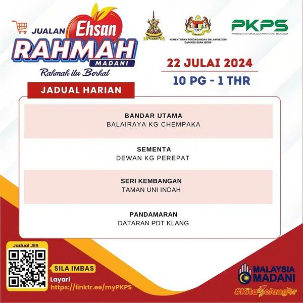 மலிவான விற்பனையின் சமீபத்திய இருப்பிடத்தை PKPS Facebook இல் அல்லது விற்பனைச் சுவரொட்டியில் உள்ள QR குறியீட்டை ஸ்கேன் செய்வதன் மூலம் அல்லது http://linktr.ee/myPKPS இணைப்பைச் சரிபார்க்கலாம்.