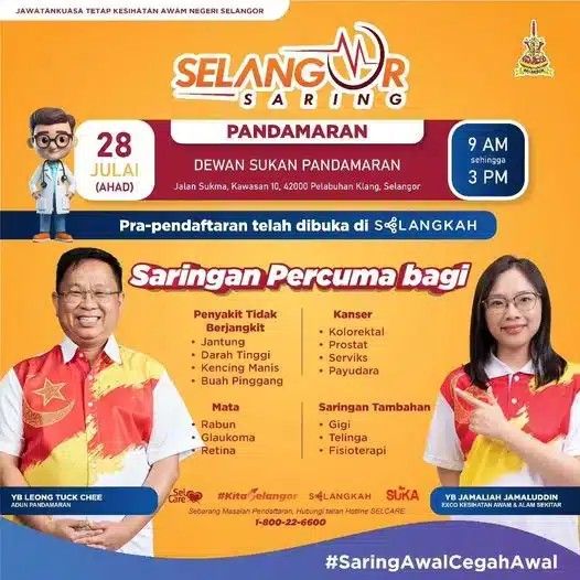 ஷா ஆலம், ஜூலை 27: பண்டமாரான் தொகுதியில் மாநில அரசால் ஏற்பாடு செய்யப்பட்ட இலவசச் சுகாதார பரிசோதனைத் திட்டம் நாளை நடைபெறும்.