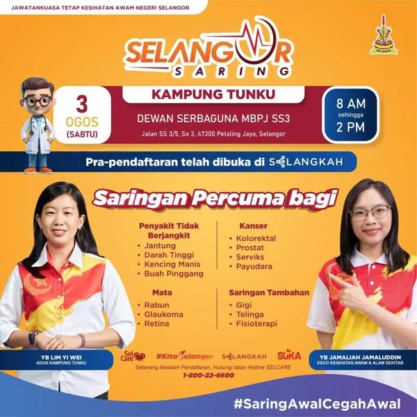 ஷா ஆலம், ஆகஸ்ட் 1 : கம்போங் துங்கு தொகுதியில் மாநில அரசால் ஏற்பாடு செய்யப்பட்ட இலவசச் சுகாதாரப் பரிசோதனைத் திட்டம் எதிர்வரும் சனிக்கிழமை அன்று நடைபெறும்.