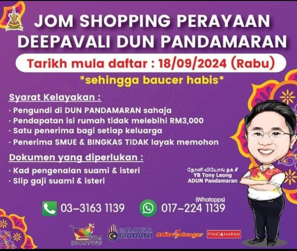 இந்த தீபாவளி இலவச ஷோம் ஷோப்பிங் இலவச பற்றுச்சீட்டுகளுக்கு இம்மாதம் 18ஆம் தேதி தொடங்கி விண்ணப்பம் செய்யலாம். இத்தொகுதிக்கு ஒதுக்கீடு செய்யப்பட்ட பற்றுச் சீட்டுகள் முடியும் வரை இதற்கான விண்ணப்பங்கள் வரவேற்கப்படும் என்று அவர் தெரிவித்தார்.