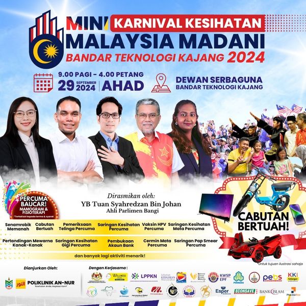 ஷா ஆலம், செப். 27- மலேசியா மடாணி மினி சுகாதார விழா இம்மாதம் 29ஆம் தேதி ஞாயிற்றுக்கிழமை பண்டார் டெக்னோலஜி காஜாங் சமூக மண்டபத்தில் நடைபெறவுள்ளது.