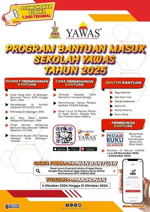 யாவாஸ் செயலி மூலம் விண்ணப்பிக்க வேண்டும் என்றும், தகுதியுடையவர்களுக்கான உதவியை நவம்பர் 28 முதல் டிசம்பர் 3 வரை சிலாங்கூர் சர்வதேச புத்தகக் கண்காட்சி 2024 இல் ஏற்பாடு செய்யப் பட்டுள்ள இடத்தில் பெற்று கொள்ளலாம்.