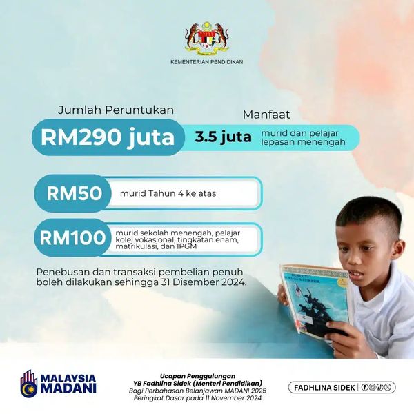 வவுச்சர்கள் வழங்கப் பட்டன மற்றும் அதே நேரத்தில் இடைநிலைப் பள்ளி, தொழிற்கல்லூரி, படிவம் ஆறு, மெட்ரிகுலேஷன் மற்றும் இன்ஸ்டிட்யூட் பெண்டிடிகன் குரு மலேசியா (IPGM) மாணவர்களுக்கு RM100 மதிப்புள்ள வவுச்சர்கள் வழங்கப்பட்டன”என்று அவர் கூறினார்.