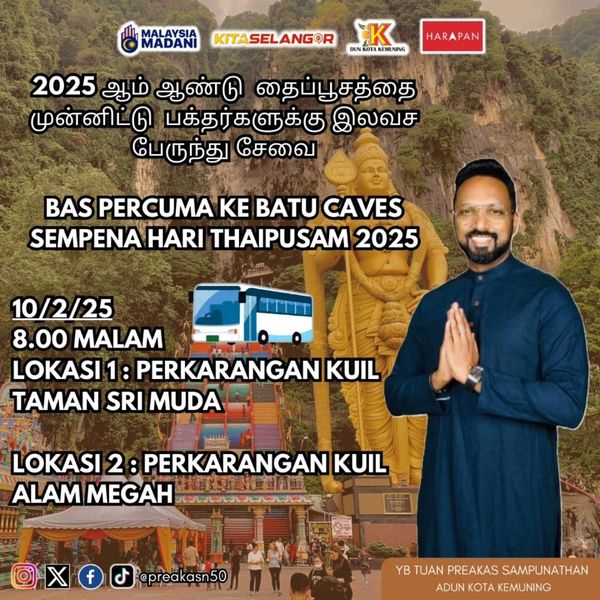 ஷா ஆலம், பிப் 5: எதிர்வரும் பிப்ரவரி 10ஆம் திகதி தைப்பூசத்தை முன்னிட்டு பக்தர்களுக்கு இலவச பேருந்து சேவையை கோத்தா கெமுனிங் சட்டமன்ற மக்கள் சேவை மன்றம் ஏற்பாடு செய்துள்ளது.
