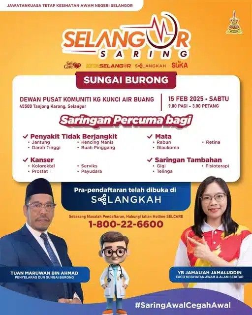 இந்த சிலாங்கூர் சாரிங் நிகழ்வுக்கு வருகை தந்து பொதுவான உடல் பரிசோதனை, இரத்தம், சிறுநீர், புற்றுநோய், கண் மற்றும் பல் பரிசோதனைகளை இலவசமாகப் மேற்கொள்வதற்கான வாய்ப்பைப் பயன்படுத்திக் கொள்ள பொதுமக்கள் கேட்டுக் கொள்ளப்படுகிறார்கள்.