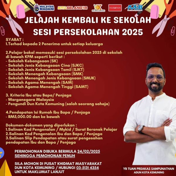 மேலும் தகவலுக்கு, கோத்தா கெமுனிங் தொகுதியின் சமூக சேவை மையத்தை 03-5131 4354 என்ற எண்ணில் தொடர்பு கொள்ளவும்.