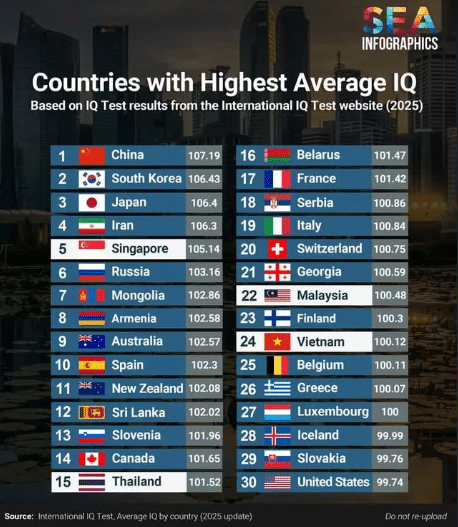தொற்று நோய், உணவுப் பழக்க வழக்கம், அறிவுசார் நடவடிக்கைகள் மற்றும் மரபியல் உள்ளிட்ட அம்சங்கள் அடிப்படையில் நாட்டின் சராசரி IQ அளவிடப்படுகிறது.