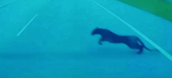 அந்த சுருஞ்சிறுத்தை எதிர்ப்புறத்திலுள்ள வனப் பகுதியை நோக்கி கடந்து சென்றதை 11 வினாடிகளைக் கொண்ட காணொளியில் காண முடிகிறது.
