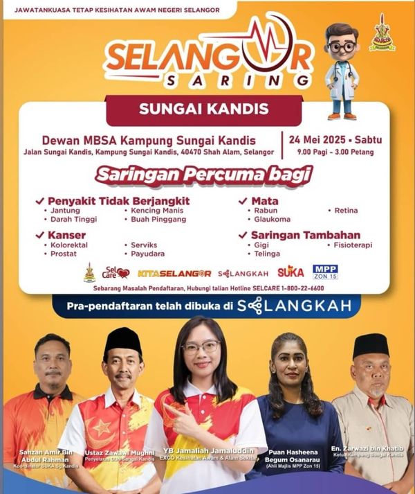ஷா ஆலம், மே 23 – சிலாங்கூர் மாநில அரசின் மக்கள் நலத் திட்டங்களில் ஒன்றாக விளங்கும் இலவசச் சுகாதாரப் பரிசோதனைத் திட்டம் நாளை சுங்கை கண்டிஸ் தொகுதியில் நடைபெறவுள்ளது. இந்நிகழ்வு காலை 9 மணி முதல் நண்பகல் 3 மணி வரை நடைபெறும்.