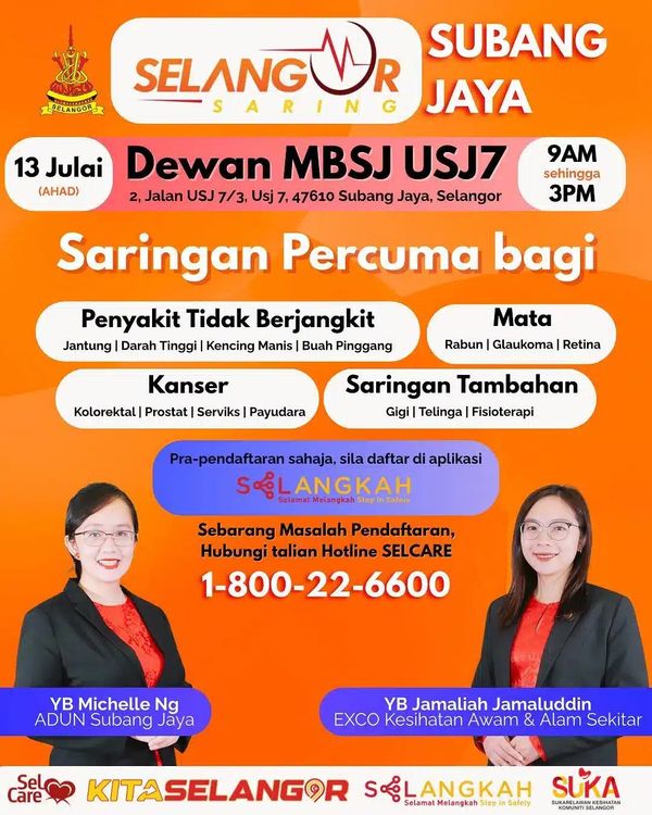 ஷா ஆலம், ஜூலை 3 – சிலாங்கூர் மாநில அரசின் மக்கள் நலத் திட்டங்களில் ஒன்றாக விளங்கும் இலவசச் சுகாதாரப் பரிசோதனைத் திட்டம் எதிர்வரும் ஜூலை 13 அன்று சுபாங் ஜெயா தொகுதியில் நடைபெறவுள்ளது. இந்நிகழ்வு காலை 9 மணி முதல் நண்பகல் 3 மணி வரை சுபாங் ஜெயா மாநகராட்சியின் பல்நோக்கு மண்டபத்தில் நடைபெறும்.