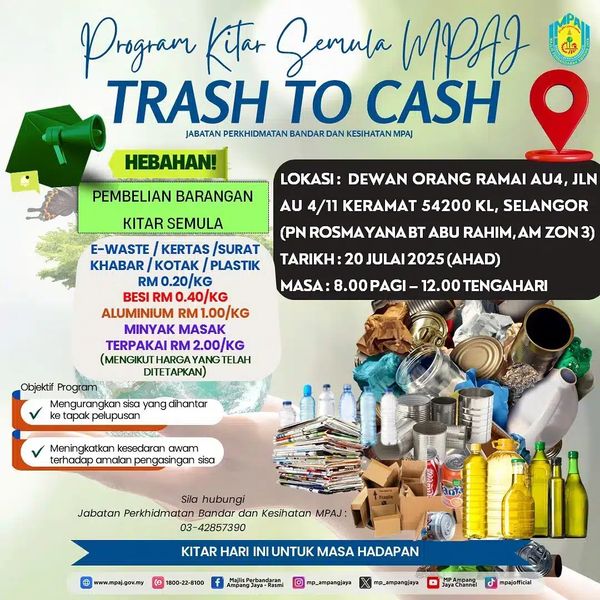 ஷா ஆலம், ஜூலை 17: இந்த ஞாயிற்றுக்கிழமை, கெராமட், ஜாலான் AU4/11இல் உள்ள AU4 பொது மண்டபத்தில் மறுசுழற்சி (Trash To Cash) திட்டத்தை அம்பாங் ஜெயா நகராண்மை கழகம் ஏற்பாடு செய்துள்ளது.