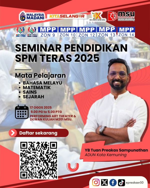 ஷா ஆலம், ஜூலை 24- கோத்தா கெமுனிங் சட்டமன்றத் தொகுதி இலிட் ப்ரோ பயிற்சி மற்றும் ஆலோசக சேவை மையத்துடன் இணைந்து 2025 எஸ்.பி.எம். தேர்வை எழுதும் மாணவர்களுக்காக சிறப்பு வழிகாட்டி கருத்தரங்கை நடத்தவுள்ளது.