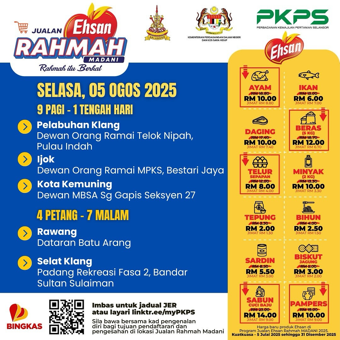 ஷா ஆலம், ஜூலை 31 : அரிசி, முட்டை போன்ற பல்வேறு அடிப்படைப் பொருட்களை மலிவு விலையில் விற்கும் ஜுவாலான் எஹ்சான் ரஹ்மா திட்டம் இன்று ஐந்து இடங்களில் காலை 10 மணிக்குத் தொடரும்.