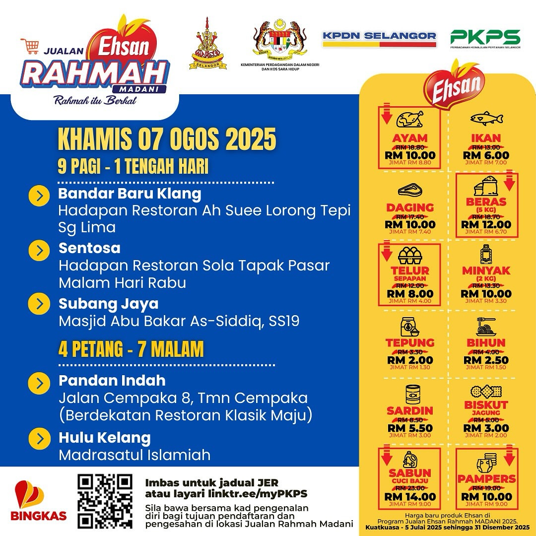 ஷா ஆலம், ஆகஸ்ட் 7 : அரிசி, முட்டை போன்ற பல்வேறு அடிப்படைப் பொருட்களை மலிவு விலையில் விற்கும் ஜுவாலான் எஹ்சான் ரஹ்மா திட்டம் இன்று ஐந்து இடங்களில் காலை 10 மணிக்குத் தொடரும்.