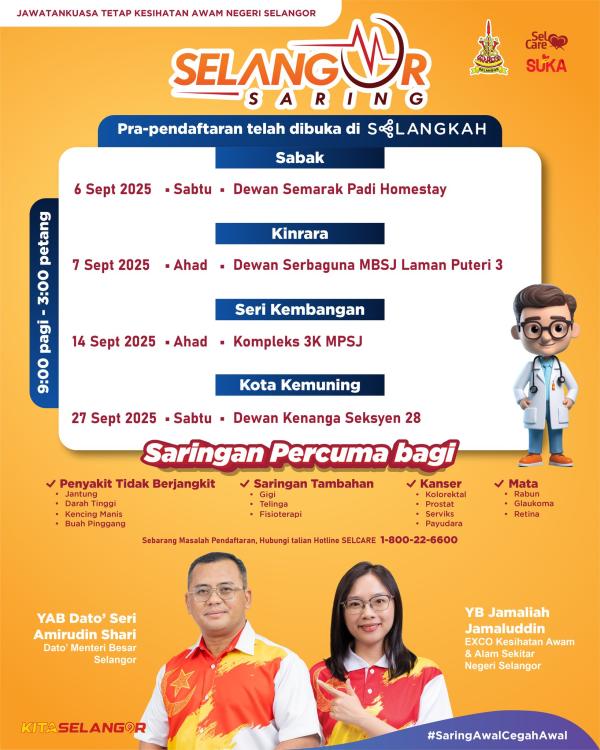 ஷா ஆலம், செப் 9 – சிலாங்கூர் மாநில அரசின் மக்கள் நலத் திட்டங்களில் ஒன்றாக விளங்கும் இலவசச் சுகாதாரப் பரிசோதனைத் திட்டம் எதிர்வரும் ஞாயிறு அன்று ஶ்ரீ கெம்பாங்கானில் நடைபெறவுள்ளது. இந்நிகழ்வு காலை 9 மணி முதல் நண்பகல் 3 மணி வரை கொம்பெலெக்ஸ் 3கே எம்பிஎஸ்ஜேயில் நடைபெறும்.