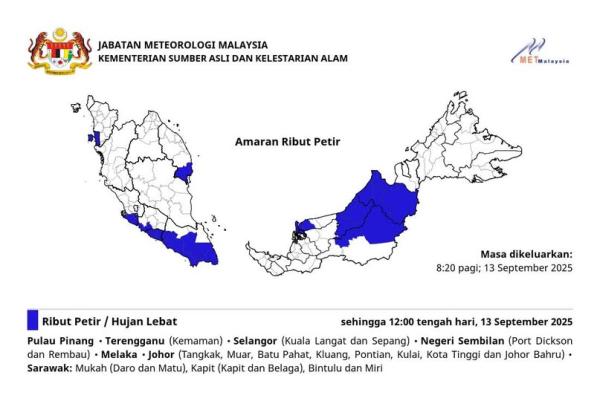 அதேபோல், பினாங்கு, மலாக்கா, திராங்கானு, நெகிரி செம்பிலான், ஜொகூர் மற்றும் சரவாக் ஆகிய மாநிலங்களின் சில பகுதிகளுக்கும் இதேபோன்ற எச்சரிக்கை விடுக்கப்பட்டுள்ளது.