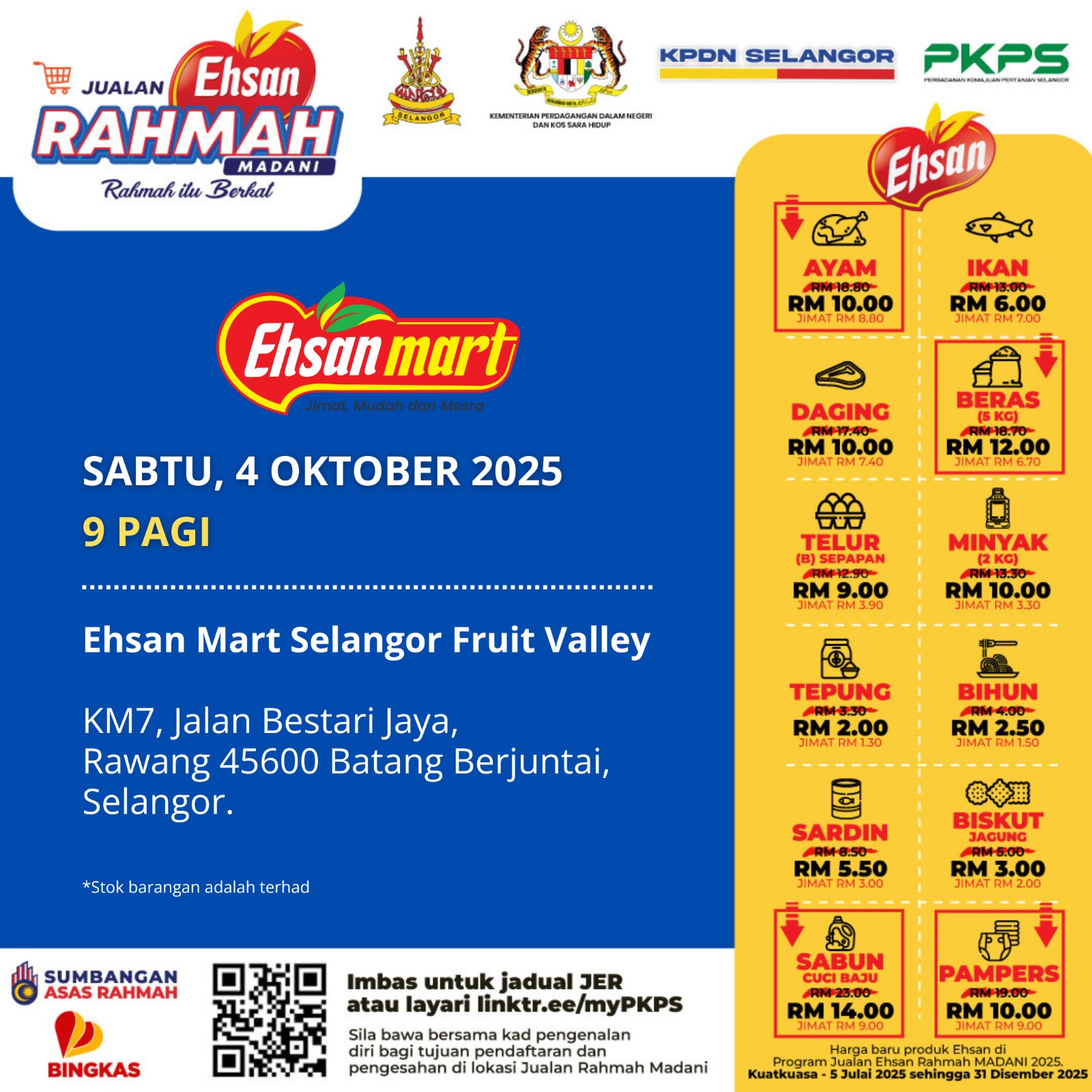 ஷா ஆலம், அக் 3: நாளை ஏஹ்சான் மார்ட் சுங்கை துவா கிளையில் சிலாங்கூர் விவசாய மேம்பாட்டு கழகத்துடன் (பிகேபிஎஸ்) இணைந்து ஏஹ்சான் ரஹ்மா விற்பனை நடைபெறும். இந்த விற்பனை காலை மணி 9 மணிக்கு ஏற்பாடு செய்யப்பட்டுள்ளது.