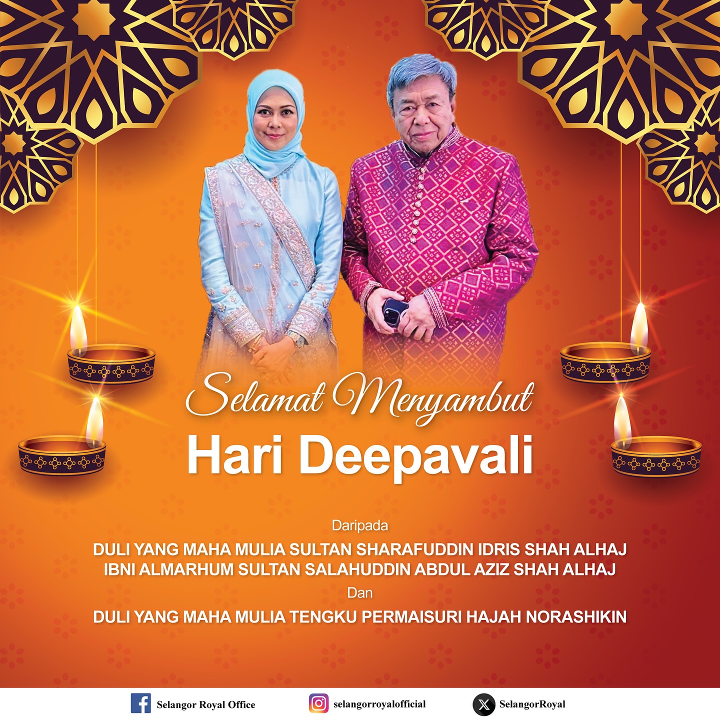 மேலும் சிலாங்கூர் சுல்தான் மற்றும் சிலாங்கூர் ராணி தெங்கு ஆகியோர், சிலாங்கூர் மாநிலத்திலும் நாடு முழுவதும் வாழும் அனைத்து இந்து மதத்தினருக்கும் இதயம் கனிந்த தீபாவளி நல்வாழ்த்துகளைத் தெரிவித்துக் கொண்டனர்.