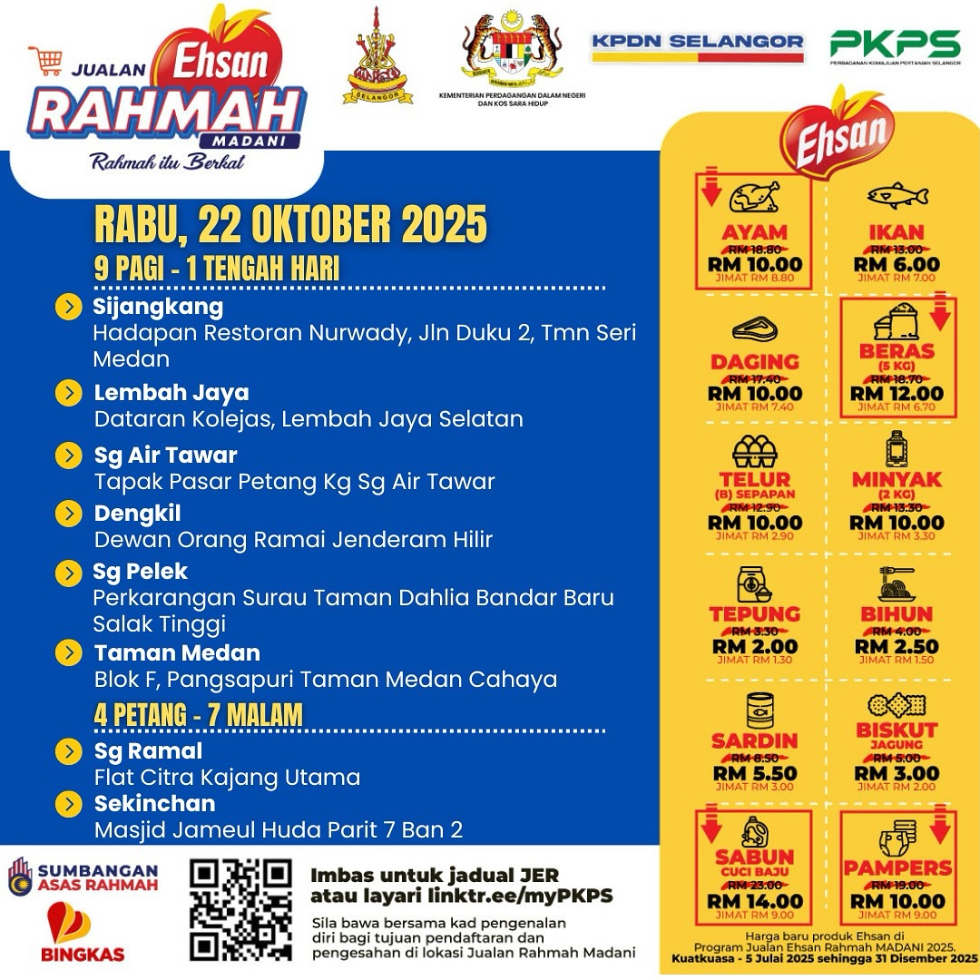 ஷா ஆலம், அக் 21 : அரிசி, முட்டை போன்ற பல்வேறு அடிப்படை பொருட்களை மலிவு விலையில் விற்கும் ஜுவாலான் எஹ்சான் ரஹ்மா திட்டம் இன்று எட்டு இடங்களில் காலை 9 மணிக்குத் தொடரும்.