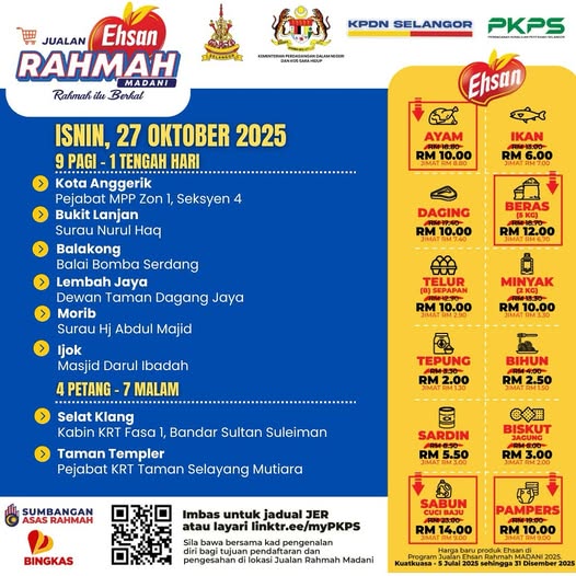 ஷா ஆலம், அக் 27 : அரிசி, முட்டை போன்ற பல்வேறு அடிப்படை பொருட்களை மலிவு விலையில் விற்கும் ஜுவாலான் எஹ்சான் ரஹ்மா திட்டம் இன்று எட்டு இடங்களில் காலை 9 மணிக்குத் தொடரும்.