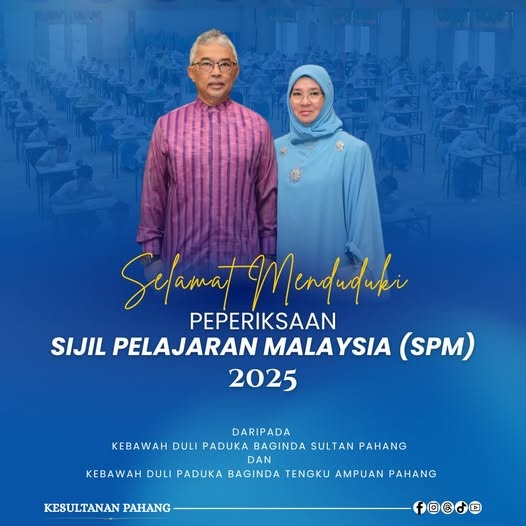 இந்த எஸ்.பி.எம் 2025 தேர்வெழுதும் அனைத்து மாணவர்களுக்கும் பகாங் மாநில ஆட்சியாளர் அல்-சுல்தான் அப்துல்லா ரியாத்துதீன் அல்-முஸ்தபா பில்லா ஷா மற்றும் பஹாங் தெங்கு அம்புவான் துங்கு அஜிஸா அமினா மைமுனா இஸ்கண்டாரியா ஆகியோர் தங்கள் நல்வாழ்த்துகளைத் தெரிவித்துள்ளனர்.