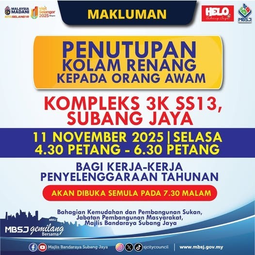 சுபாங் ஜெயா, நவ 11- சுபாங் ஜெயா SS13-இல் உள்ள 3K வளாகத்தின் நீச்சல்குளம் (Kolam Renang Kompleks 3K, SS13 Subang Jaya), வருடாந்திரப் பராமரிப்புப் பணிகளுக்காக இன்று (நவம்பர் 11, 2025, செவ்வாய்க்கிழமை) தற்காலிகமாக மூடப்படும் என்று அறிவிக்கப்பட்டுள்ளது.