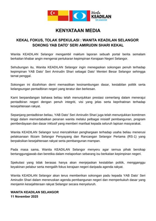 சிலாங்கூர் முதல் திட்டம் (RS-1) மற்றும் சிலாங்கூர் மக்கள் நலத் திட்டங்களை அமல்படுத்தும் அவரது முயற்சிகளுக்கு மகளிர் PKR பாராட்டைத் தெரிவித்துள்ளது. அதே சமயம், ஆதாரமற்ற ஊகங்கள் அரசியல் ஸ்திரத்தன்மையைக் குலைக்கும், முதலீட்டாளர்களைத் தொந்தரவு செய்யும் மற்றும் மக்கள் நலனைப் பற்றிய அரசாங்கத்தின் நிகழ்ச்சி நிரலைத் திசைதிருப்பும் என்பதால், மாநிலத் தலைமை குறித்த செய்திகளைப் பொறுப்புடனும் நெறிமுறையுடனும் வெளியிடுமாறு அனைத்து தரப்பினரையும் சிலாங்கூர் மகளிர் PKR வலியுறுத்தியுள்ளது.