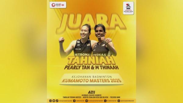 கோலாலம்பூர், நவ 17- ஜப்பான் மாஸ்டர்ஸ் பொதுப் பூப்பந்து போட்டியின் மகளிர் இரட்டையர் இணை பெர்லி தான் - எம்.தீனா வாகை சூடிய நிலையில் துணைப்பிரதமர் டத்தோஶ்ரீ அஹ்மட் ஸாஹிட் ஹமிடி மனமார்ந்த வாழ்த்துகளைத் தெரிவித்துக்கொண்டுள்ளார்.