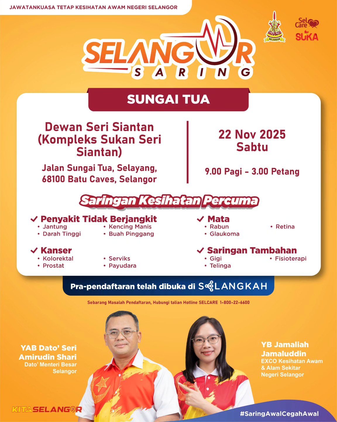 ஷா ஆலம், நவ 17– சிலாங்கூர் மாநில அரசின் மக்கள் நலத் திட்டங்களில் ஒன்றாக விளங்கும் இலவசச் சுகாதாரப் பரிசோதனைத் திட்டம் எதிர்வரும் சனிக்கிழமை அன்று சுங்கை துவாவில் நடைபெறவுள்ளது.