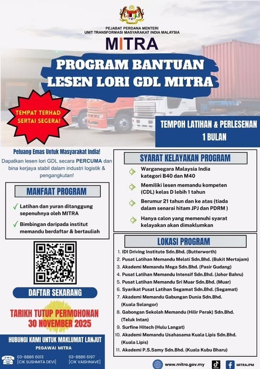 கோலாலம்பூர், நவ 19- மலேசிய இந்திய சமுதாய மாற்றத்திற்கான பிரிவு (மித்ரா) மலேசிய இந்திய இளைஞர்களிடையே வேலைவாய்ப்பையும் வருமானத்தையும் மேம்படுத்தும் நோக்கில், சரக்கு வாகன ஓட்டுநர் உரிமம் (GDL - Goods Driving License) பெறுவதற்கான லாரி உரிம உதவித் திட்டம் (GDL Lori MITRA) குறித்த அறிவிப்பைப் போஸ்டர் மூலம் வெளியிட்டுள்ளது.