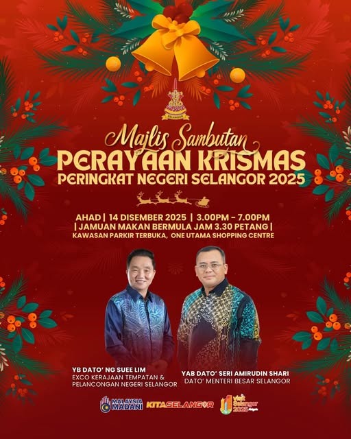 ஷா ஆலாம், நவ 26- சிலாங்கூர் மாநிலத்தின் கிறிஸ்துமஸ் கொண்டாட்டம் 2025 மீண்டும் வரவிருக்கிறது. இந்த ஆண்டுக்கான மாநில அளவிலான கிறிஸ்துமஸ் கொண்டாட்டத்தில் அனைவரும் உற்சாகமாகக் கலந்துகொண்டு மகிழ்ச்சியைப் பகிர்ந்துகொள்ளலாம்.