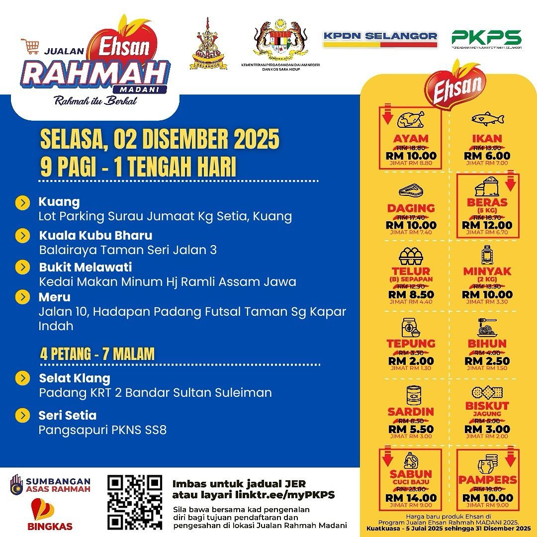 ஷா ஆலம், டிச 2 : அரிசி, முட்டை போன்ற பல்வேறு அடிப்படை பொருட்களை மலிவு விலையில் விற்கும் ஜுவாலான் எஹ்சான் ரஹ்மா திட்டம் இன்று ஆறு இடங்களில் காலை 9 மணிக்குத் தொடரும்.