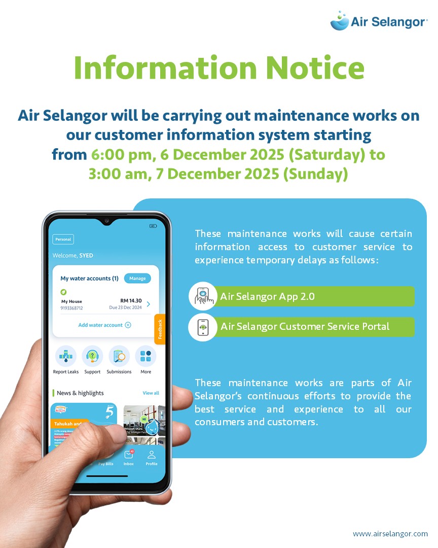 அந்நிறுவனம் தனது இணையதளத்தில் வெளியிட்ட அறிவிப்பில், Air Selangor App 2.0 மற்றும் ஆயர் சிலாங்கூர் வாடிக்கையாளர் சேவை வலைத்தளம் போன்ற பல தளங்களில் குறிப்பிட்ட காலத்தில் தற்காலிக தாமதங்கள் ஏற்படக்கூடும் என தெரிவித்தது.