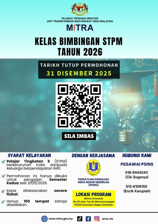 கோலாலம்பூர், டிச 5- பிரதமர் துறை அமைச்சரவையின் கீழ் இயங்கும் மலேசிய இந்தியர் சமூக மாற்றம் பிரிவு (MITRA), 2026 ஆம் ஆண்டுக்கான STPM வழிகாட்டி வகுப்புகளை (Kelas Bimbingan STPM Tahun 2026) நடத்துவதற்கான விண்ணப்பங்கள் திறக்கப்பட்டுள்ளதாக அறிவித்துள்ளது.