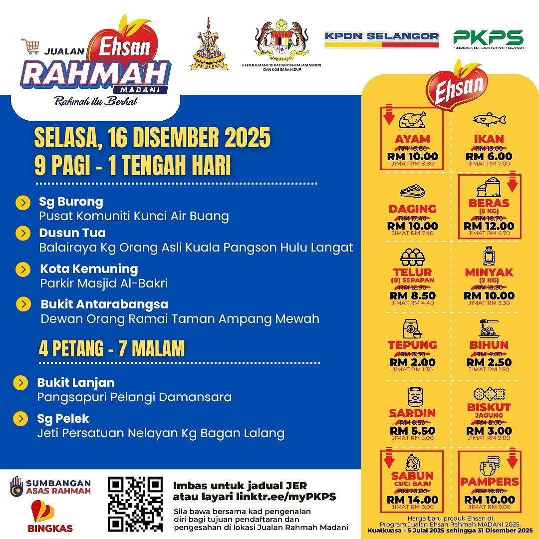 ஷா ஆலம், டிச 16 : அரிசி, முட்டை போன்ற பல்வேறு அடிப்படை பொருட்களை மலிவு விலையில் விற்கும் ஜுவாலான் எஹ்சான் ரஹ்மா திட்டம் இன்று ஆறு இடங்களில் காலை 9 மணிக்குத் தொடரும்.