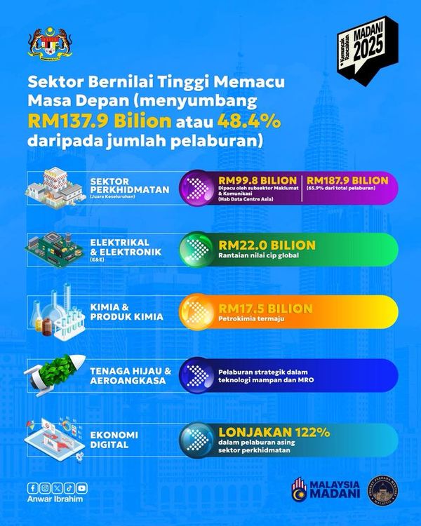 அதேபோல், உயர்மதிப்பு துறைகள் எதிர்காலத்தை இயக்குவதில் முக்கிய பங்கு வகித்து, மொத்த முதலீட்டில் RM137.9 பில்லியன் அல்லது 48.4 சதவீதத்தை பங்களித்துள்ளதாகவும் குறிப்பிடப்பட்டுள்ளது.