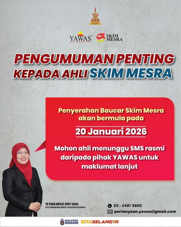ஷா ஆலம், ஜன 9 - ஸ்கிம் மெஸ்ரா வவுச்சர் திட்டத்திற்கு விண்ணப்பித்து அங்கீகரிக்கப்பட்டவர்கள் எதிர்வரும் ஜனவரி 20 முதல் தங்களின் வவுச்சர்களைப் பெற்று கொள்ளலாம் என யாயாசான் வாரிசான் அனாக் சிலாங்கூர் (யாவாஸ்) முகநூலில் அறிவித்துள்ளது.