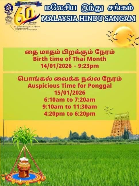 ஜனவரி 15ஆம் திகதி அன்று காலை 6.10 முதல் 7.20 மணி வரையிலும், காலை 9.10 முதல் 11.30 மணி வரையிலுமுள்ள சுபநேரங்களில் பொங்கல் வைக்கலாம் என மலேசிய இந்து சங்கத் தெரிவித்துள்ளது.